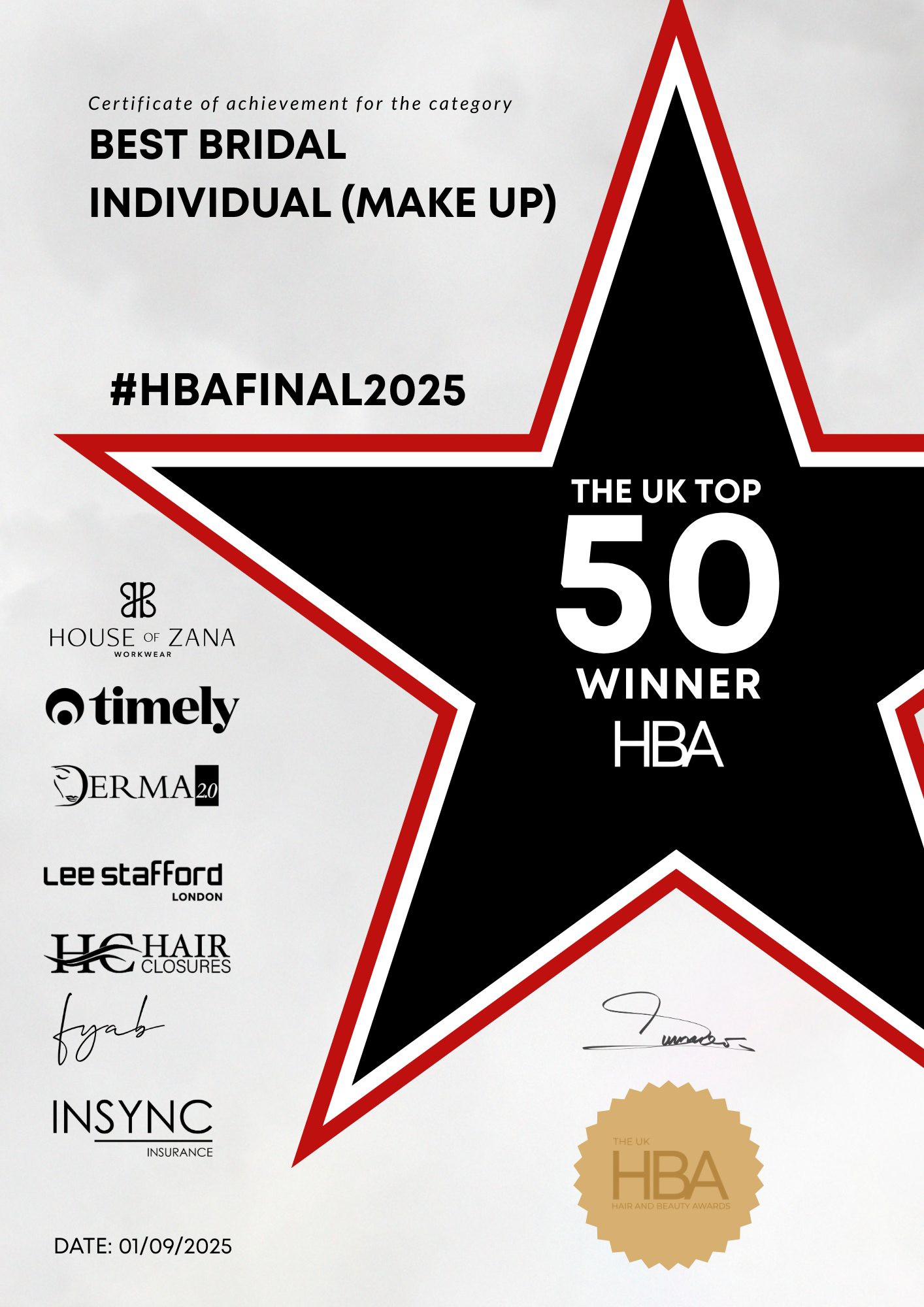 Rebecca’s exceptional artistry has been recgonized with accolades including finalist status for Makeup Artist of the Year at the Hair and Beauty Awards 2025 in Dorset.She has now been awarded 17th Best Bridal Make up Artist in the Uk 2025, by the Uk’s biggest Hair and Beauty Awards. And has been honoured as the winning Hair and Makeup Artist of the Year by HITCHED. Having also worked on the England GB woman’s Hockey team for hair and make up on Anna Toman and Emily Defroand for sporting events.
